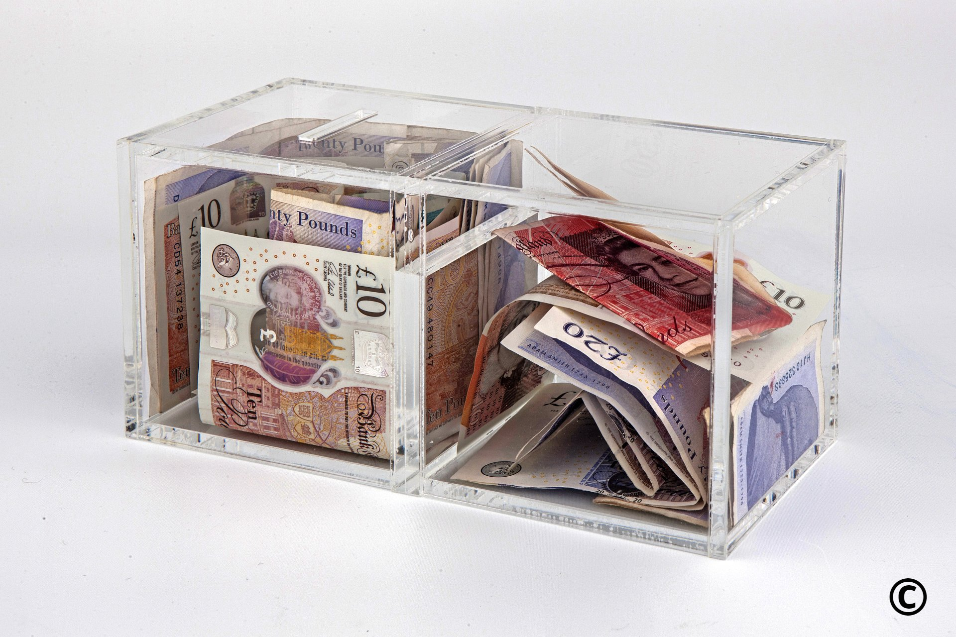 - An unspecified amount of sterling cash notes (five pounds, ten pounds, twenty pounds and fifty pounds) have been inserted into the slot in Box A and shuffled to fill both Box A and Box B.